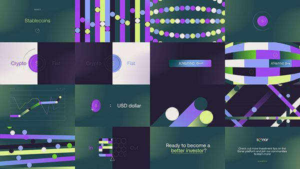 The design utilizes a dark, muted color palette with vibrant, neon-like accents to create a modern, digital, and slightly futuristic aesthetic. It employs a grid-like structure across various tiles to present different concepts in a clean, modular manner.
