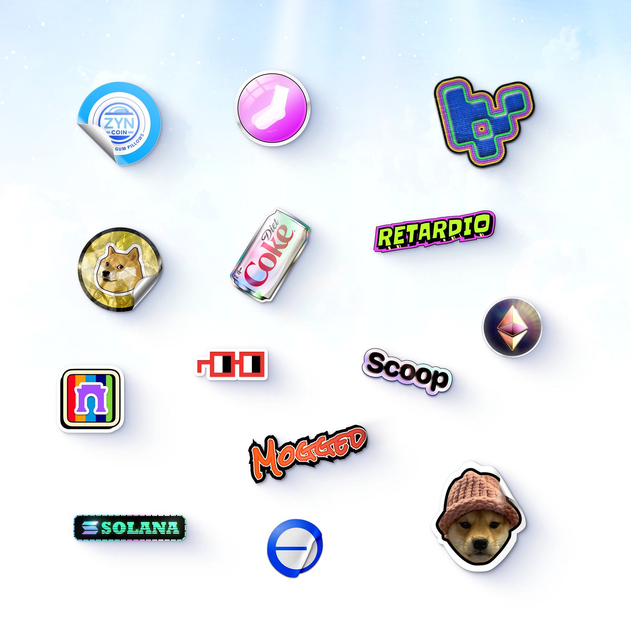 This image presents a collection of distinct digital logos and badges arranged in a clean, floating layout against a stark white background. The visual language is modern and focused on branding, utilizing varied shapes and subtle gradients to represent different digital assets or projects. The overall feel is organized, professional, and tech-oriented.