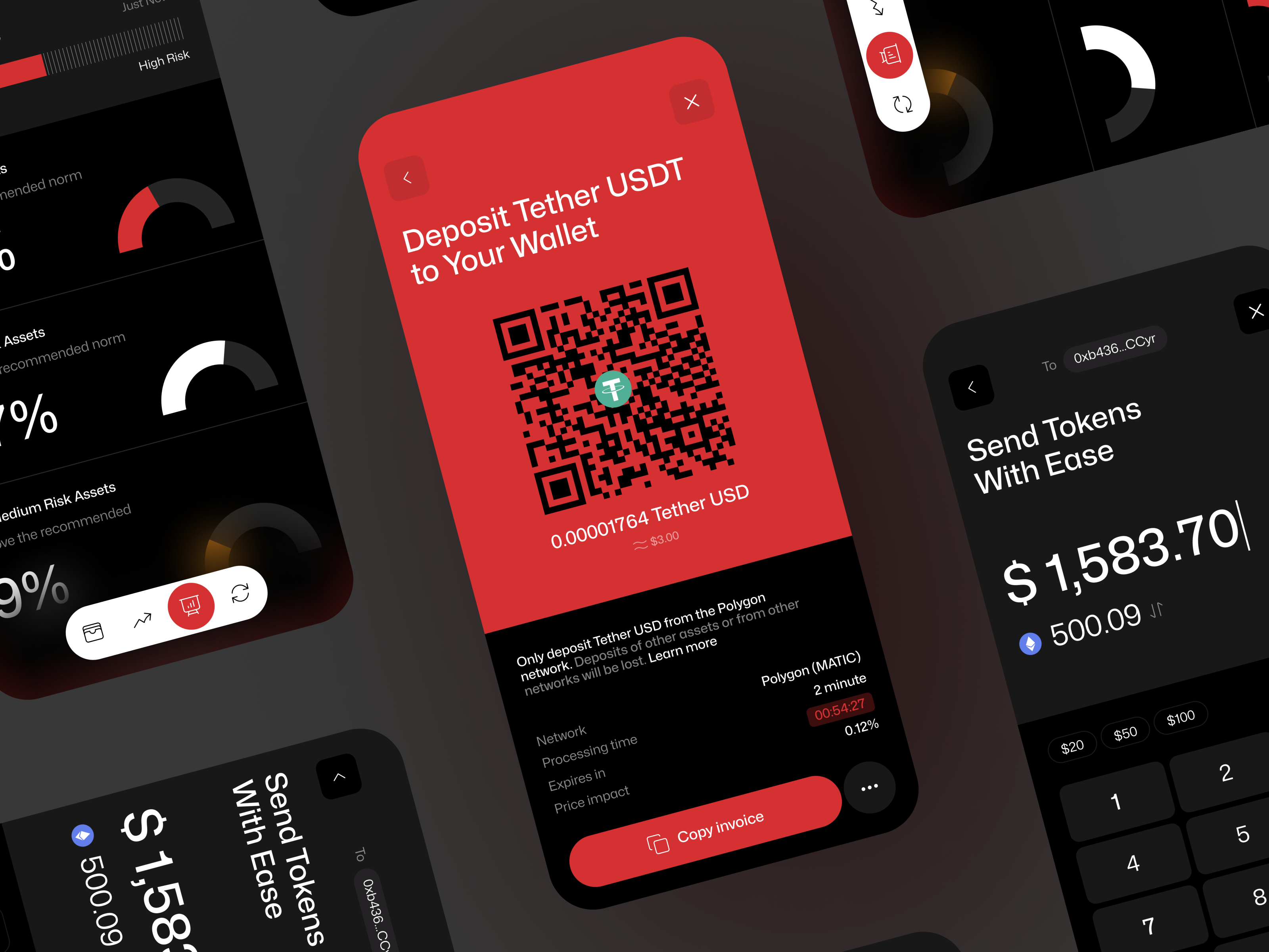 This interface utilizes a dark mode aesthetic with high contrast to create a professional and secure feel. The design is highly functional, focusing the user's attention directly on the deposit process via a prominent red call-to-action and a scannable QR code. The visual language is clean, modern, and optimized for quick transaction completion.