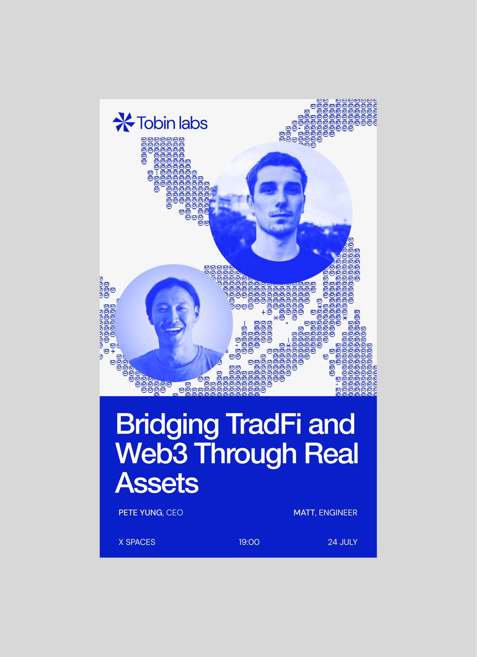 This graphic employs a clean, modern aesthetic dominated by cool blues to convey professionalism and technological innovation. The design uses circular framing and subtle digital textures to highlight the featured speakers and the serious topic of bridging traditional finance with Web3 assets. The overall feel is polished, academic, and forward-thinking.