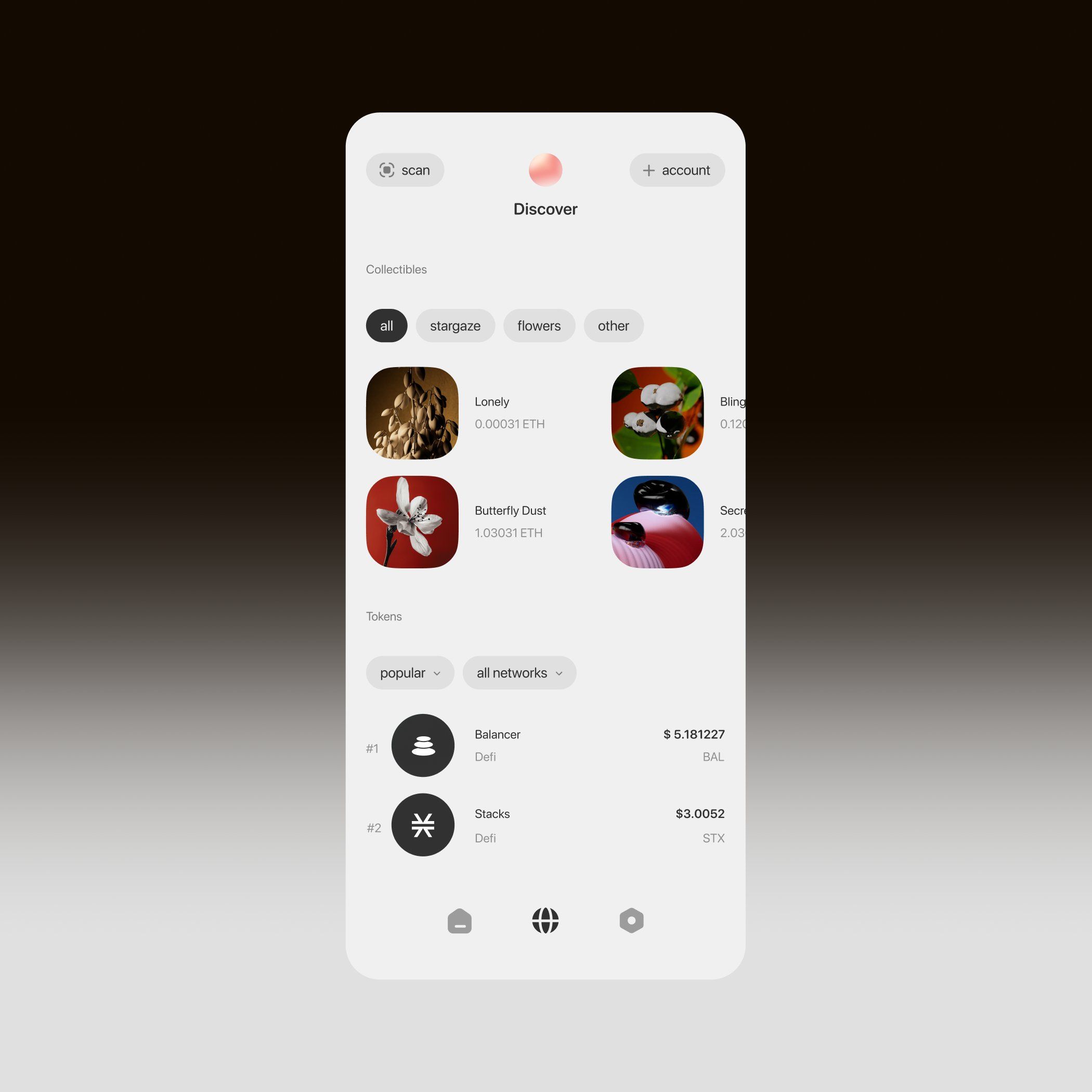 The interface presents a clean, minimalist design typical of modern decentralized applications (dApps), utilizing ample white space and subtle use of color accents to guide the user through discovery options. The visual language is functional and information-dense yet uncluttered, suggesting a focus on utility and data.