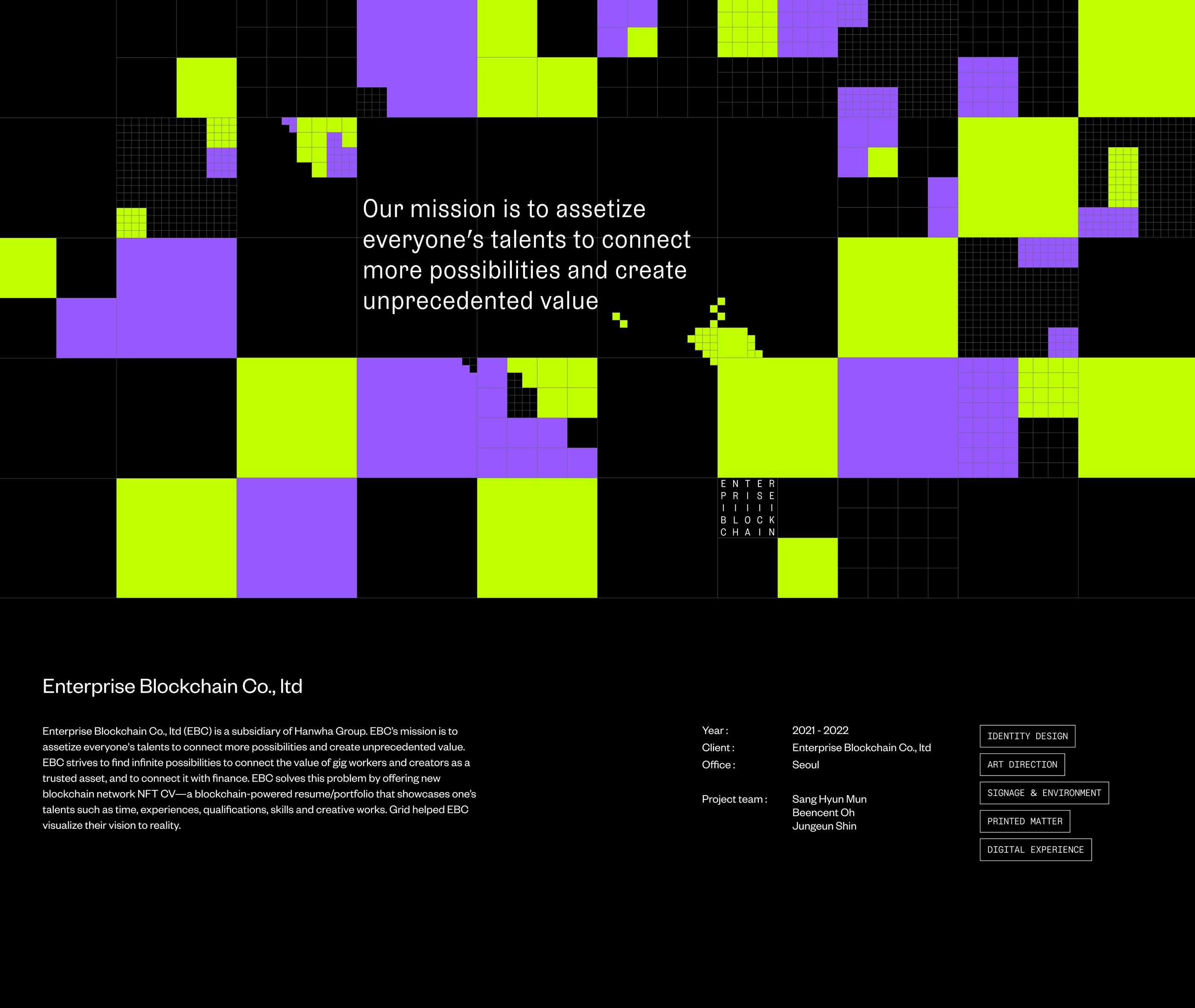 The image presents a highly abstract, grid-based visual structure dominated by contrasting blocks of neon yellow and purple against a dark background. The design suggests data visualization, network mapping, or abstract digital architecture with a clean, modern, and somewhat futuristic feel.