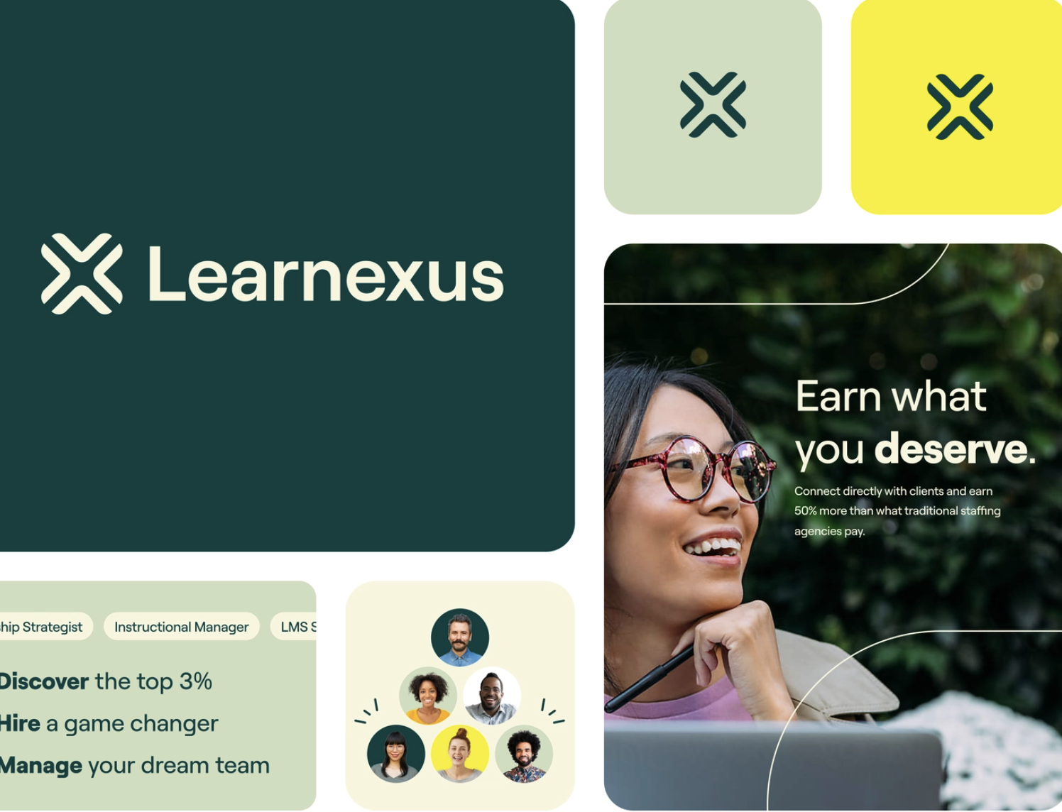 The design features a clean, modern, and professional aesthetic dominated by deep greens and muted yellows. It uses ample white space within distinct, rounded-corner blocks to present services or branding elements in a structured manner.