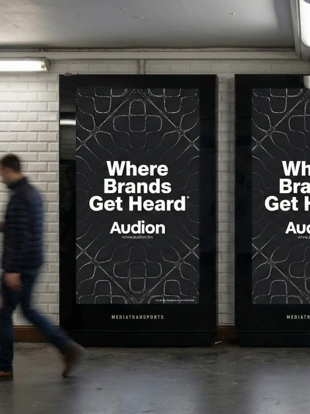 This image showcases a clean, modern display setup utilizing high contrast between dark panels and bright white textures. The design relies on strong geometric patterns and ample negative space to create a sophisticated, professional atmosphere suitable for a media or branding context.
