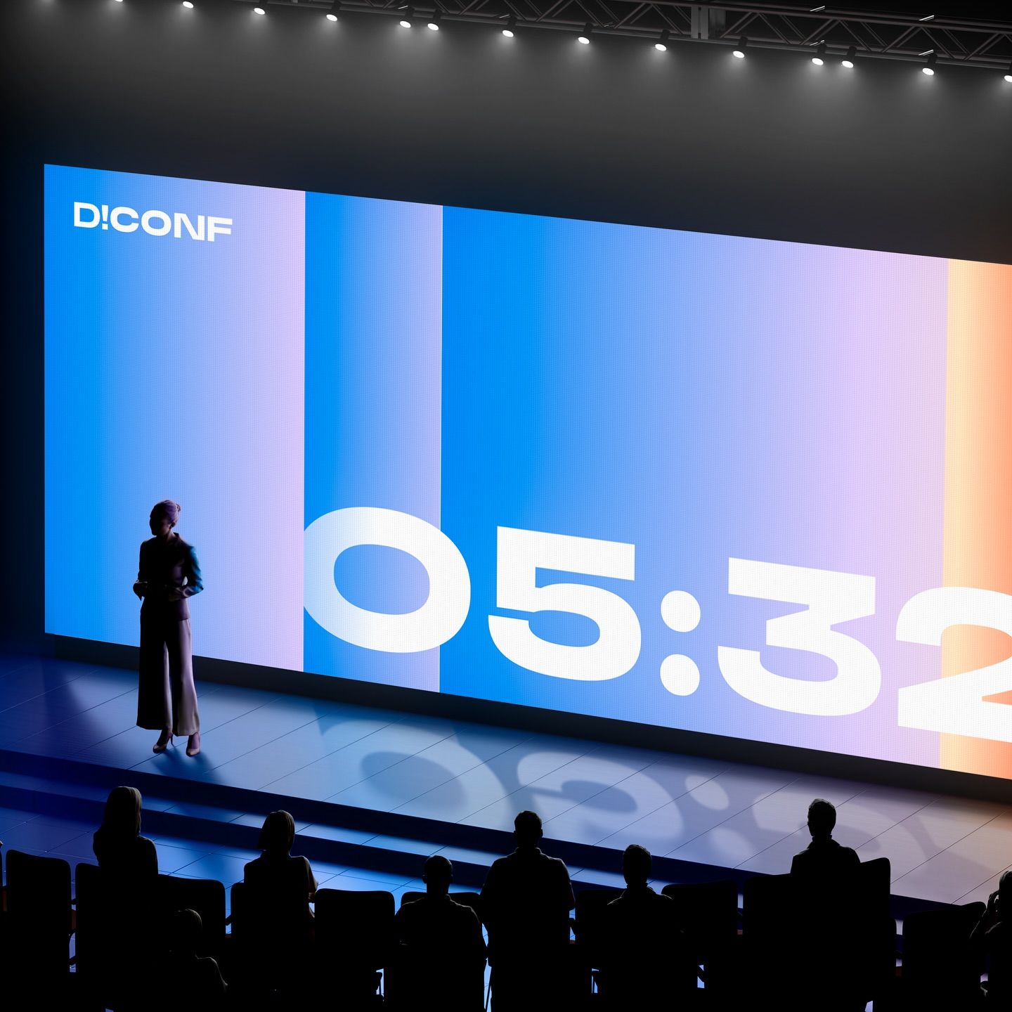 This image captures a modern, high-contrast presentation setup, utilizing vibrant digital light to draw focus. The visual language is clean and corporate, emphasizing information delivery through large-scale screen display against a dark environment.