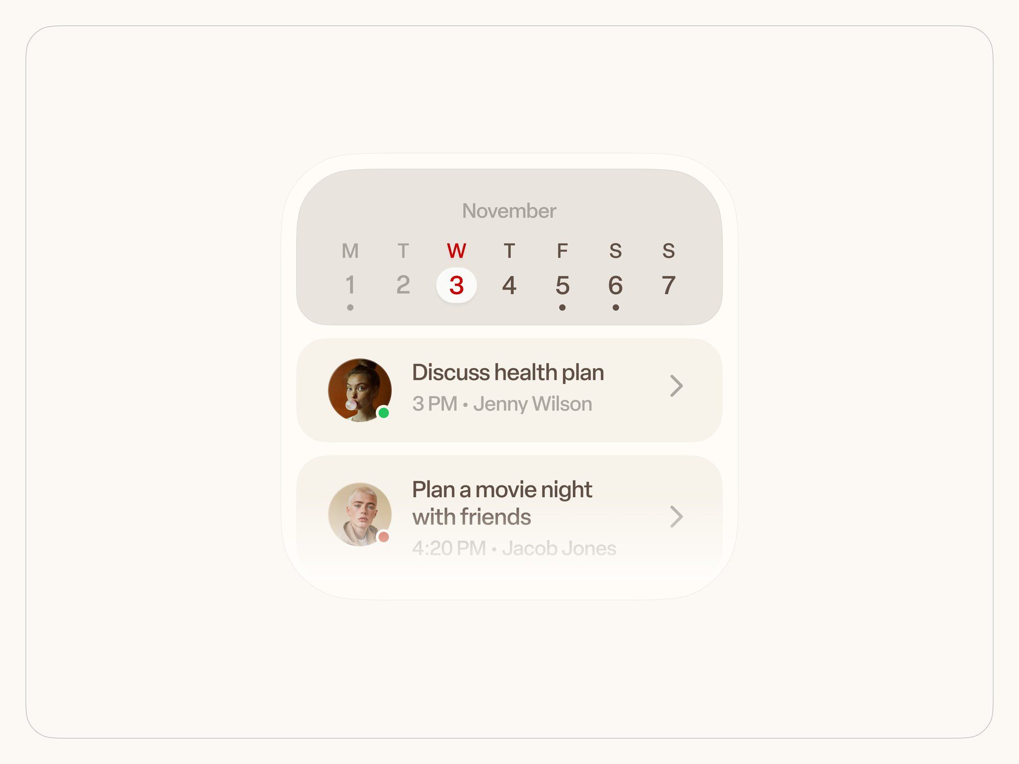 This interface features a clean, minimalist design typical of modern digital scheduling applications. The visual language relies heavily on ample white space and subtle gray tones to ensure high readability and a calm, organized user experience.