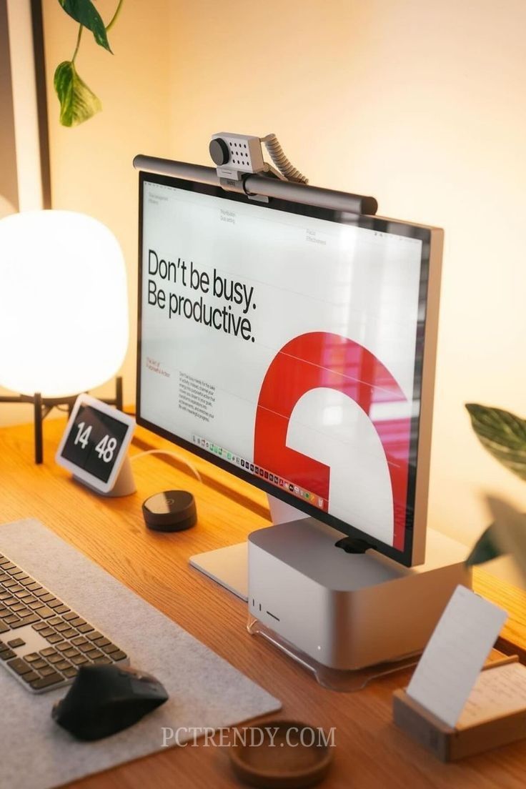 This image showcases a highly organized, minimalist workspace blending natural wood tones with sleek modern technology. The visual language emphasizes clean lines, functional design, and a serene atmosphere suitable for focused work.