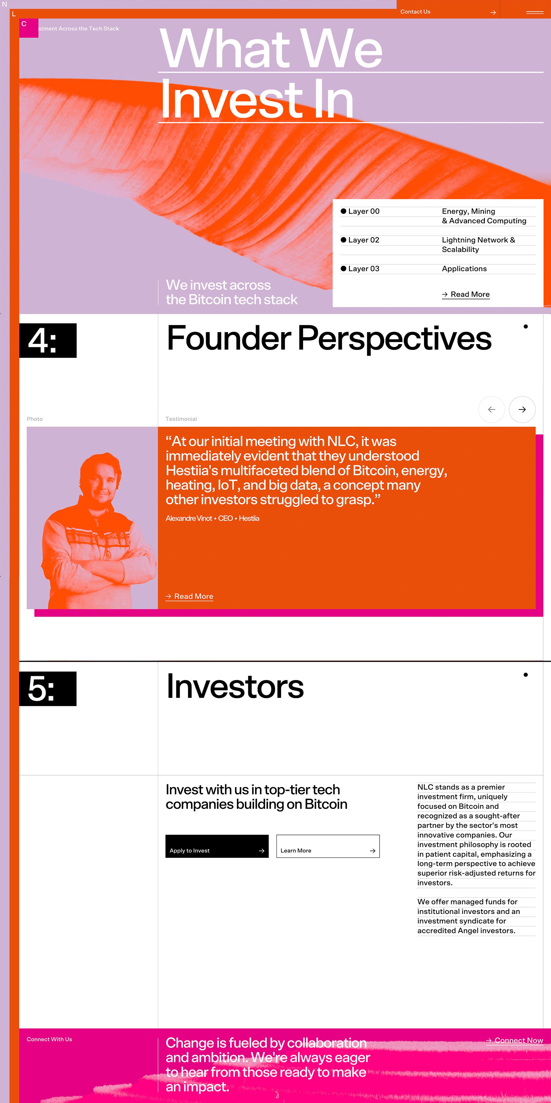 The design utilizes a clean, high-contrast modern aesthetic with bold color blocks to convey energy and professionalism. The layout is structured and hierarchical, clearly separating different investment narratives into digestible sections.