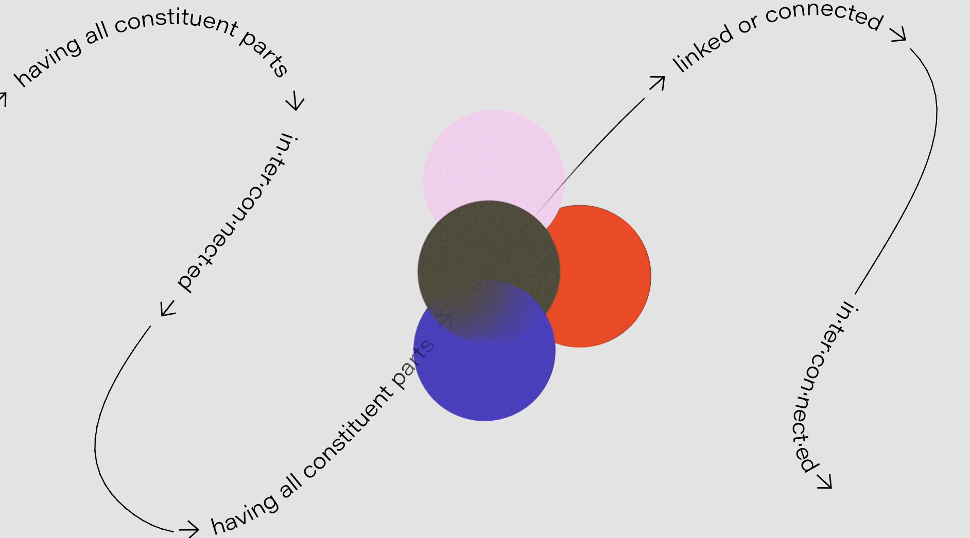 The image presents a conceptual diagram illustrating relationships between constituent parts using overlapping circles to denote connections. The design is clean and abstract, relying heavily on color and spatial overlap to convey complex relational data.