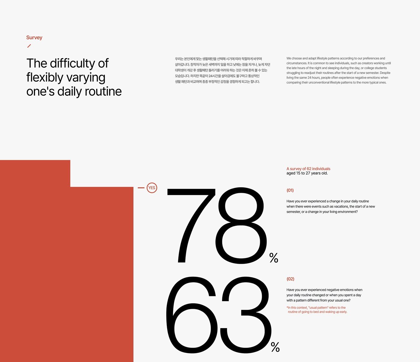 The design is minimalist and clean, utilizing a high-contrast black and white layout with a single accent color (red/terracotta) to present survey results. The visual language is direct and data-focused, prioritizing readability and stark presentation of quantitative information.