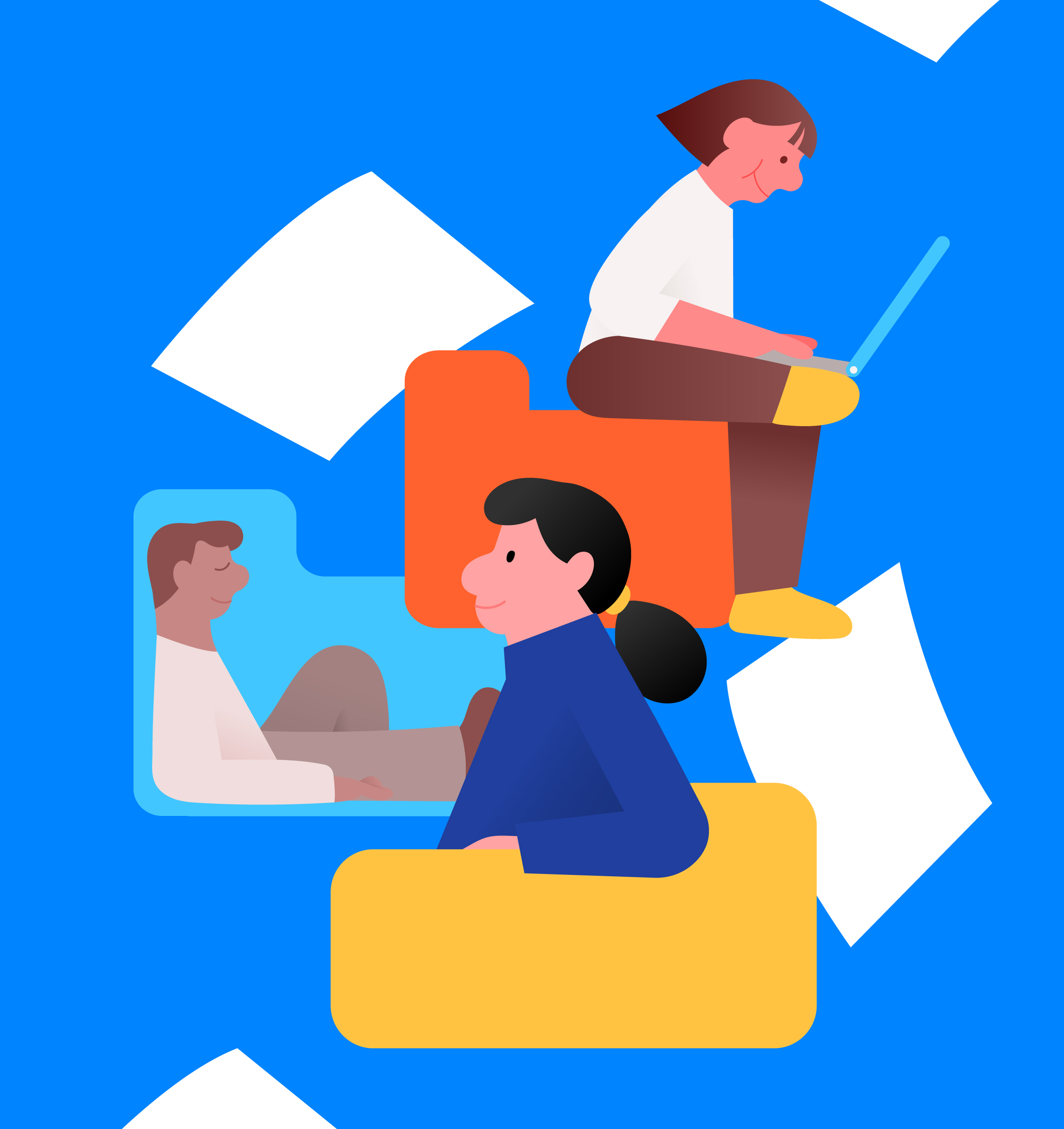 This illustration utilizes a vibrant flat design style to depict collaborative work and creative processes. The visual language is clean, modern, and relies on bold geometric shapes and simplified figures to convey interaction and teamwork effectively.