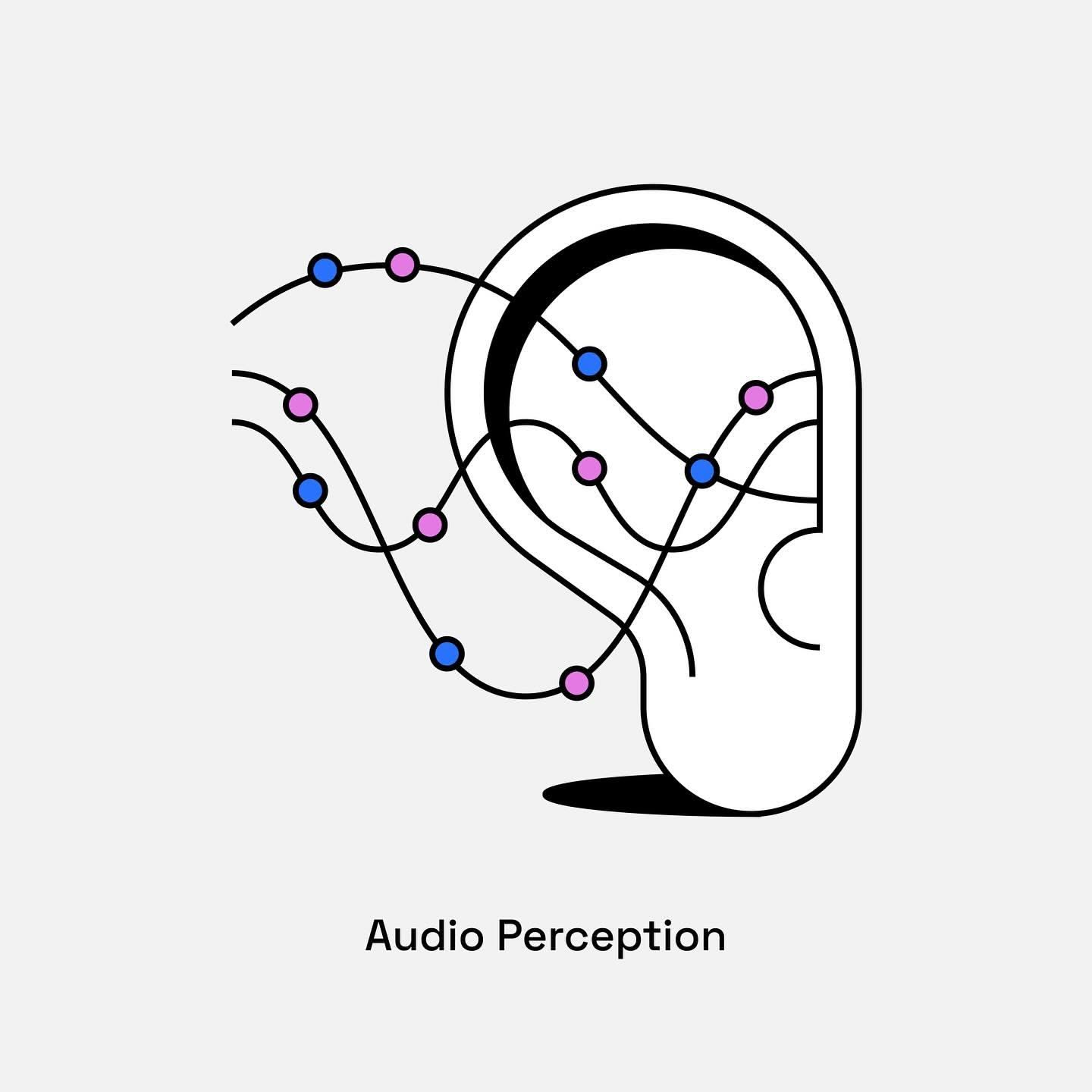 This is a minimalist line art illustration depicting an abstract representation of an ear, focusing on the concept of audio perception. The design uses thin, continuous lines to suggest sound waves or neural pathways within the structure of the ear.