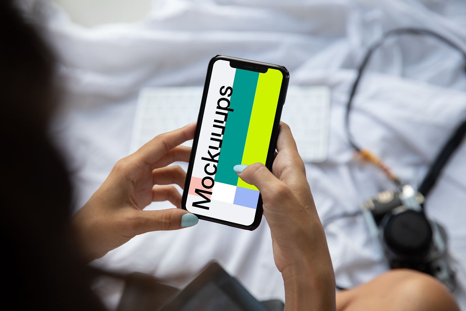 The image captures a close-up of a hand holding a smartphone displaying a colorful mockup interface, suggesting a focus on digital design or prototyping. The visual language is clean and modern, emphasizing vibrant color blocking against a white background.