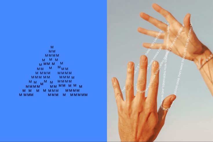 The image presents a stark, minimalist comparison between abstract text representation and a physical gesture. It juxtaposes a dense, uniform pattern of 'M's in a solid color field against the organic lines and form of a human hand, creating a conceptual link between digital/symbolic representation and physical action.