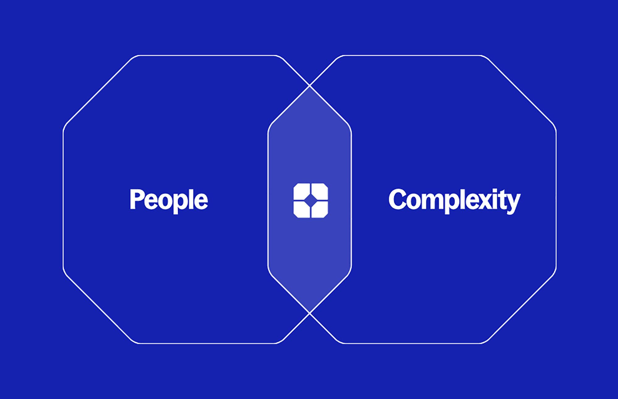 This is a clean, minimalist infographic design using geometric shapes to represent abstract concepts. The visual language relies on clear separation and a subtle intersection point to suggest the relationship between people and complexity.