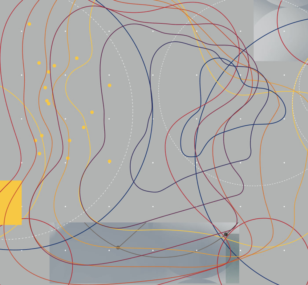 This abstract composition features a dense network of fluid, overlapping lines rendered in muted tones against a neutral gray background. The visual language is highly organic and dynamic, suggesting movement, connectivity, or complex data flow through its layered structure.