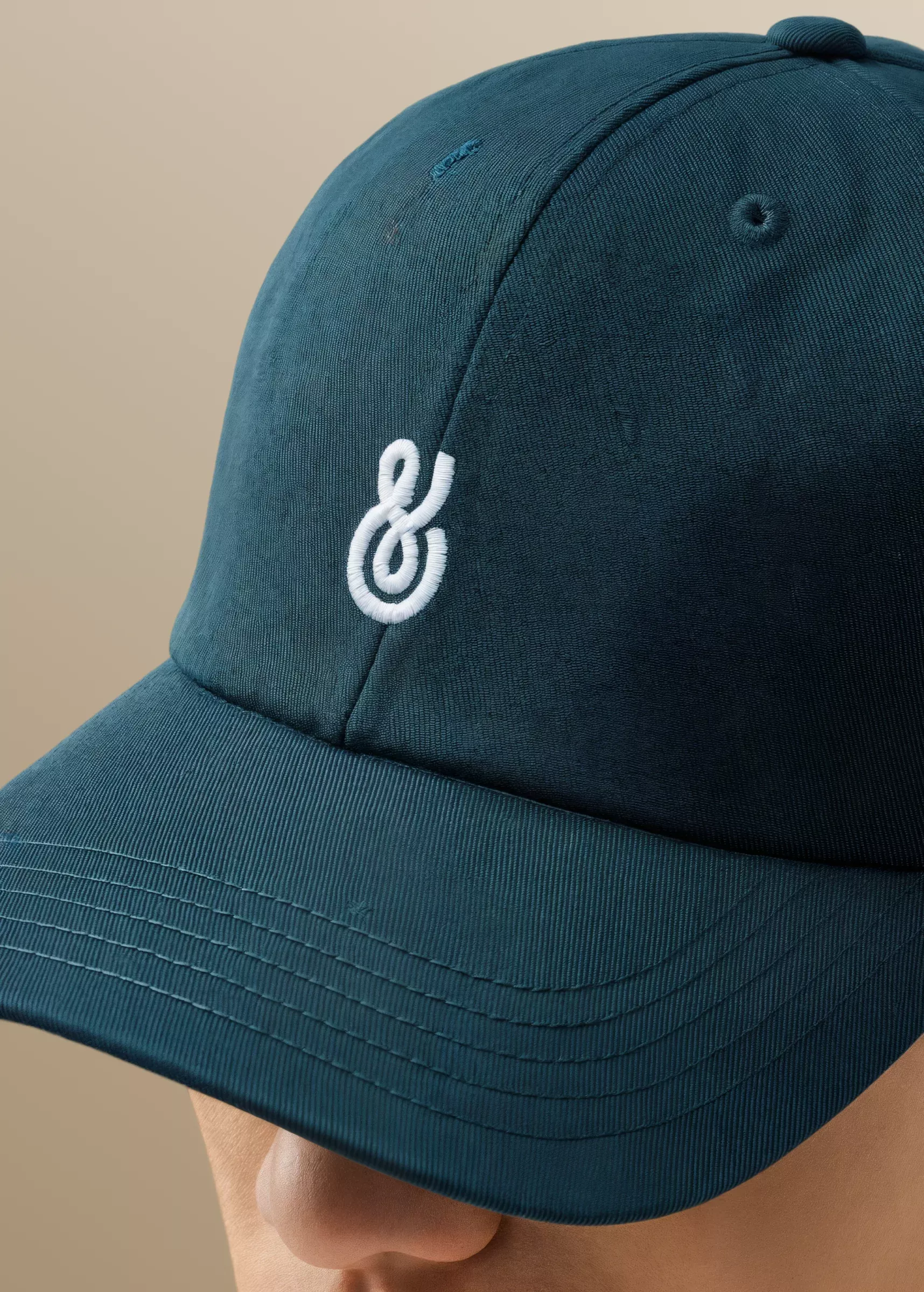 This image captures a close-up of a structured, dark teal cap featuring minimalist white embroidery. The visual language is clean and functional, emphasizing the quality of the fabric and the subtle detail provided by the custom logo. It conveys a sense of understated, modern casualness.