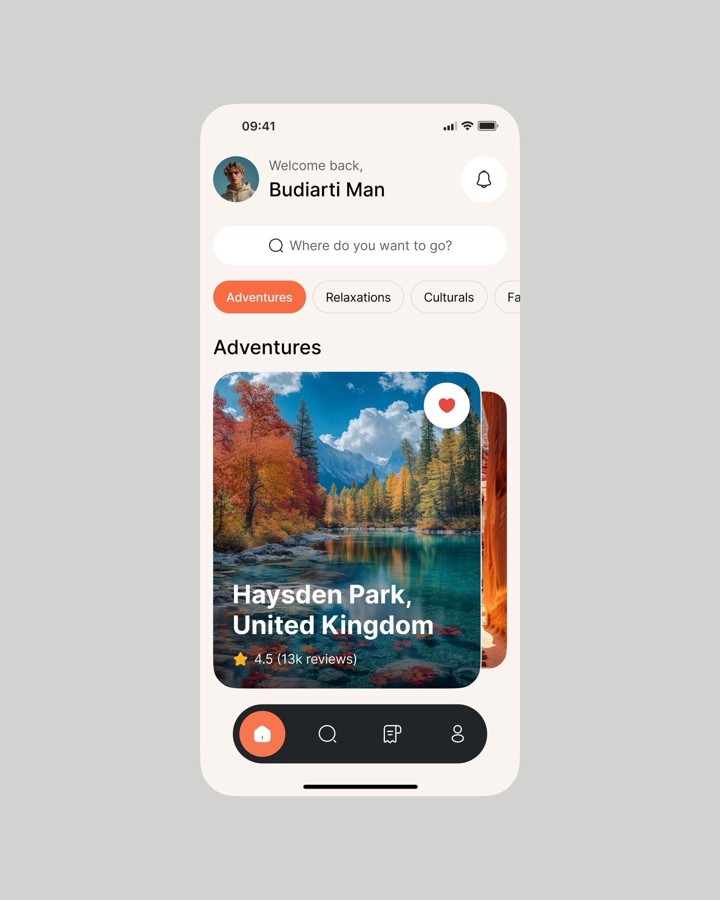 The interface presents a clean, modern mobile application screen focused on travel or adventure recommendations. It uses high-quality photography to evoke a sense of natural beauty and encourages user interaction through clear navigation elements.