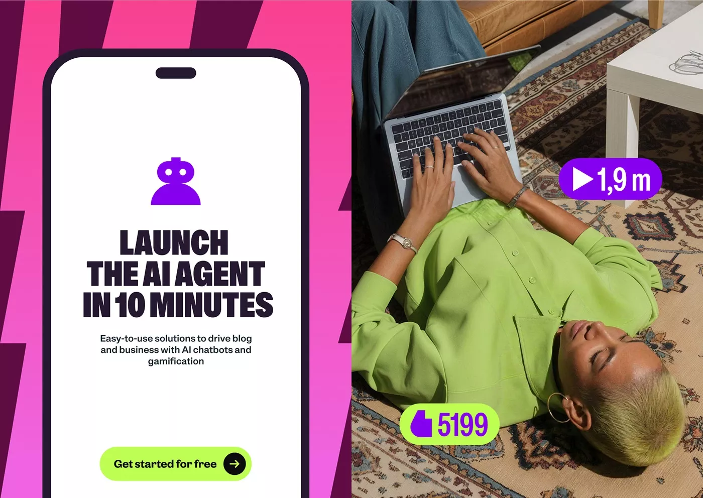 This composite design utilizes a vibrant color split against a clean white mockup to highlight a digital product. The visual language is modern, professional, and energetic, effectively communicating speed and ease of use for AI solutions.
