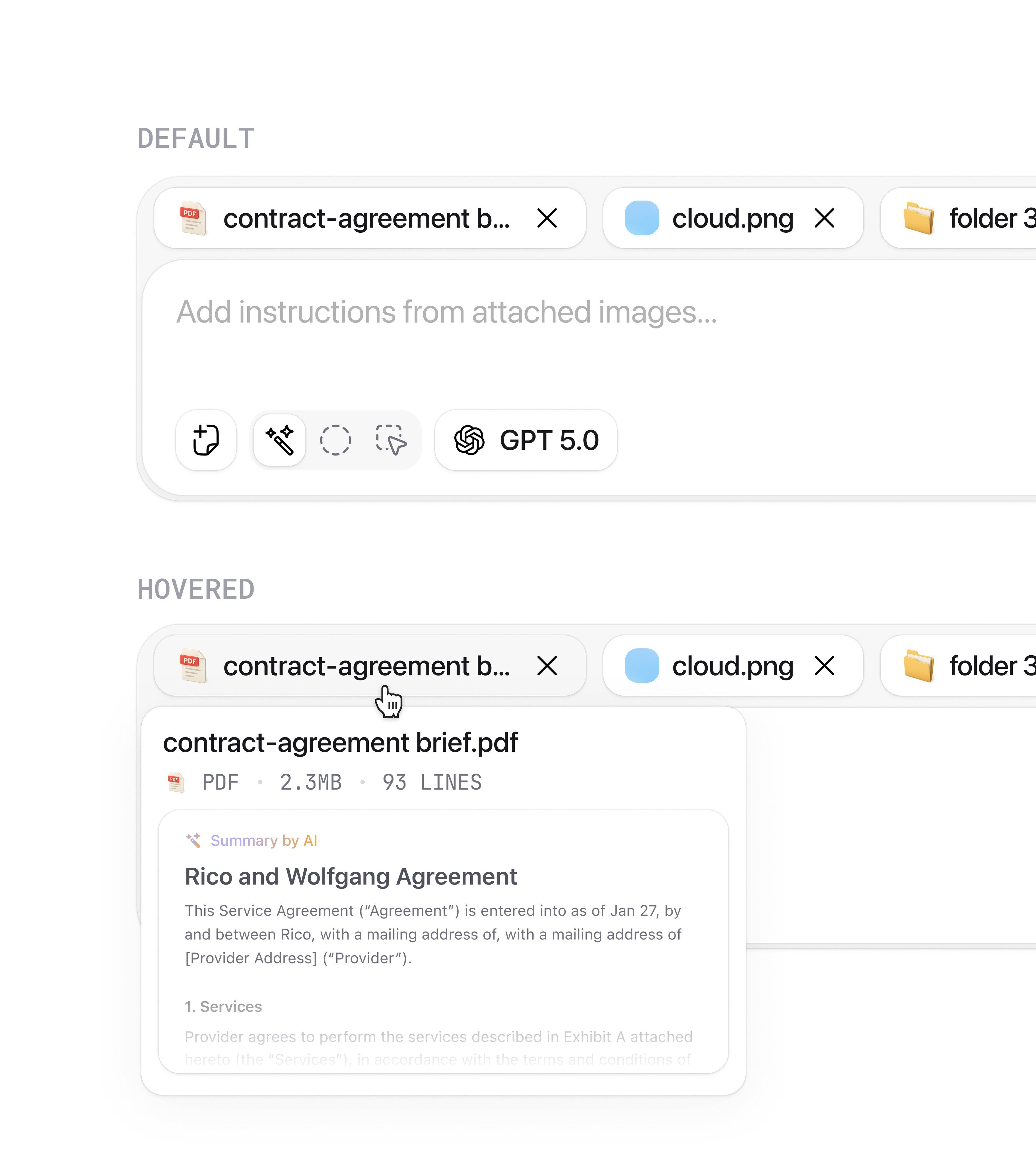 The interface displays a clean, functional user experience prioritizing clarity and organized data management. The design uses white space effectively to separate various components like file previews and AI instructions, resulting in a highly structured and professional appearance.