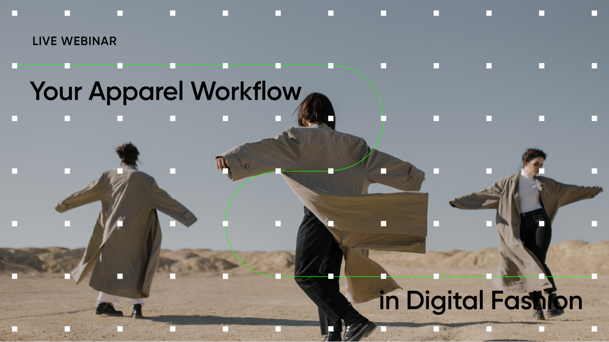 This visual utilizes a clean, minimalist style to illustrate a conceptual workflow in fashion, blending photographic silhouettes with overlaid text and guiding lines. The overall design is professional and modern, emphasizing movement and the relationship between physical apparel and digital concepts.