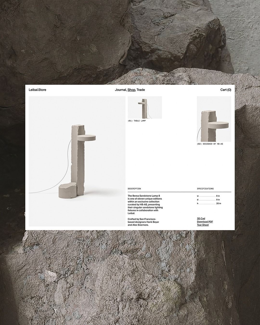 A minimalist product specification sheet featuring a sculptural concrete or stone lamp design, presented with technical drawings and dimensional details. The layout combines clean modernist typography with product photography against a textured, weathered stone background, creating a sophisticated contrast between refined design documentation and raw materiality.