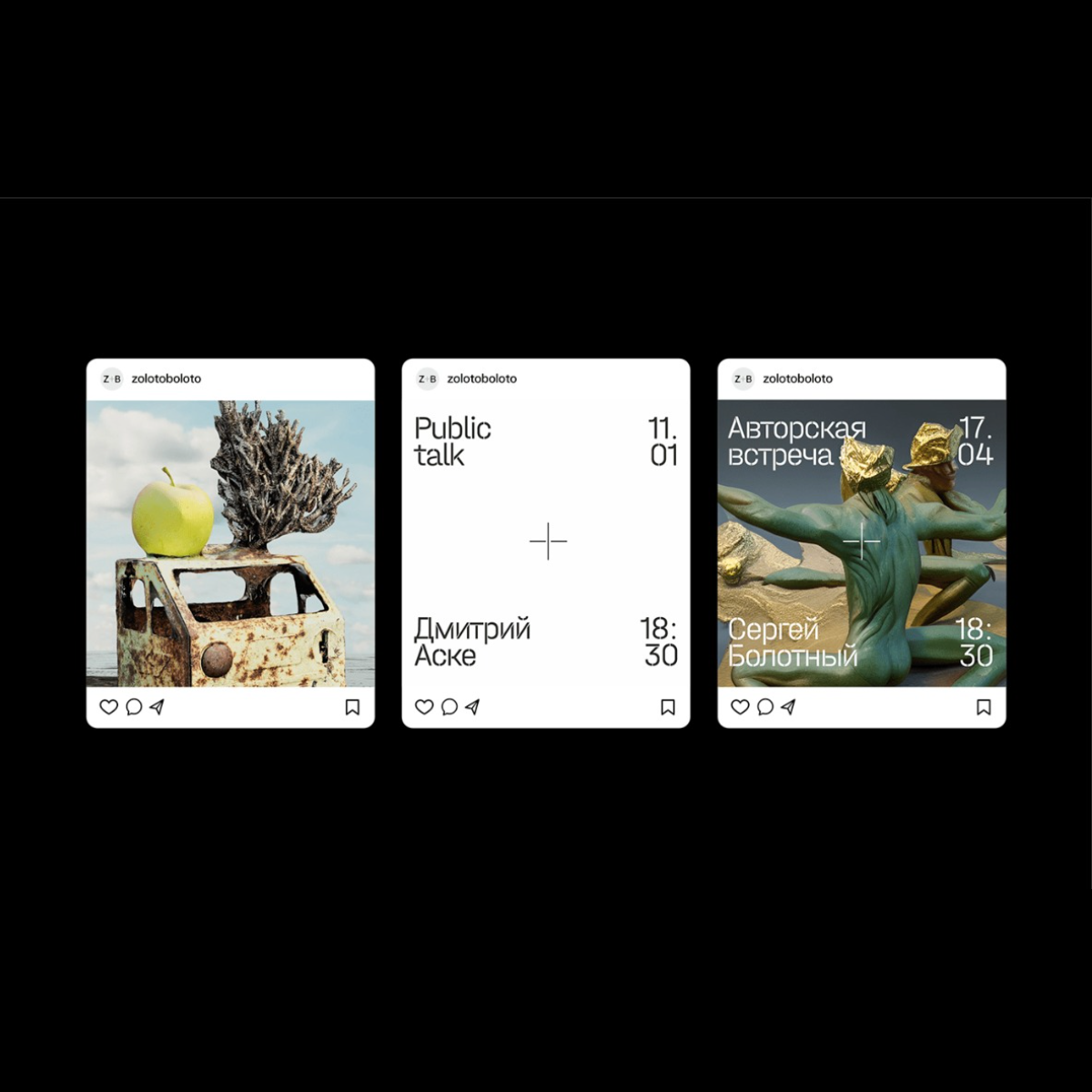 A minimalist social media interface design showcasing three Instagram-style cards with clean typography and curated imagery. The layout demonstrates a modern, gallery-like presentation with Cyrillic text, emphasizing content curation and user engagement through a stark black background.