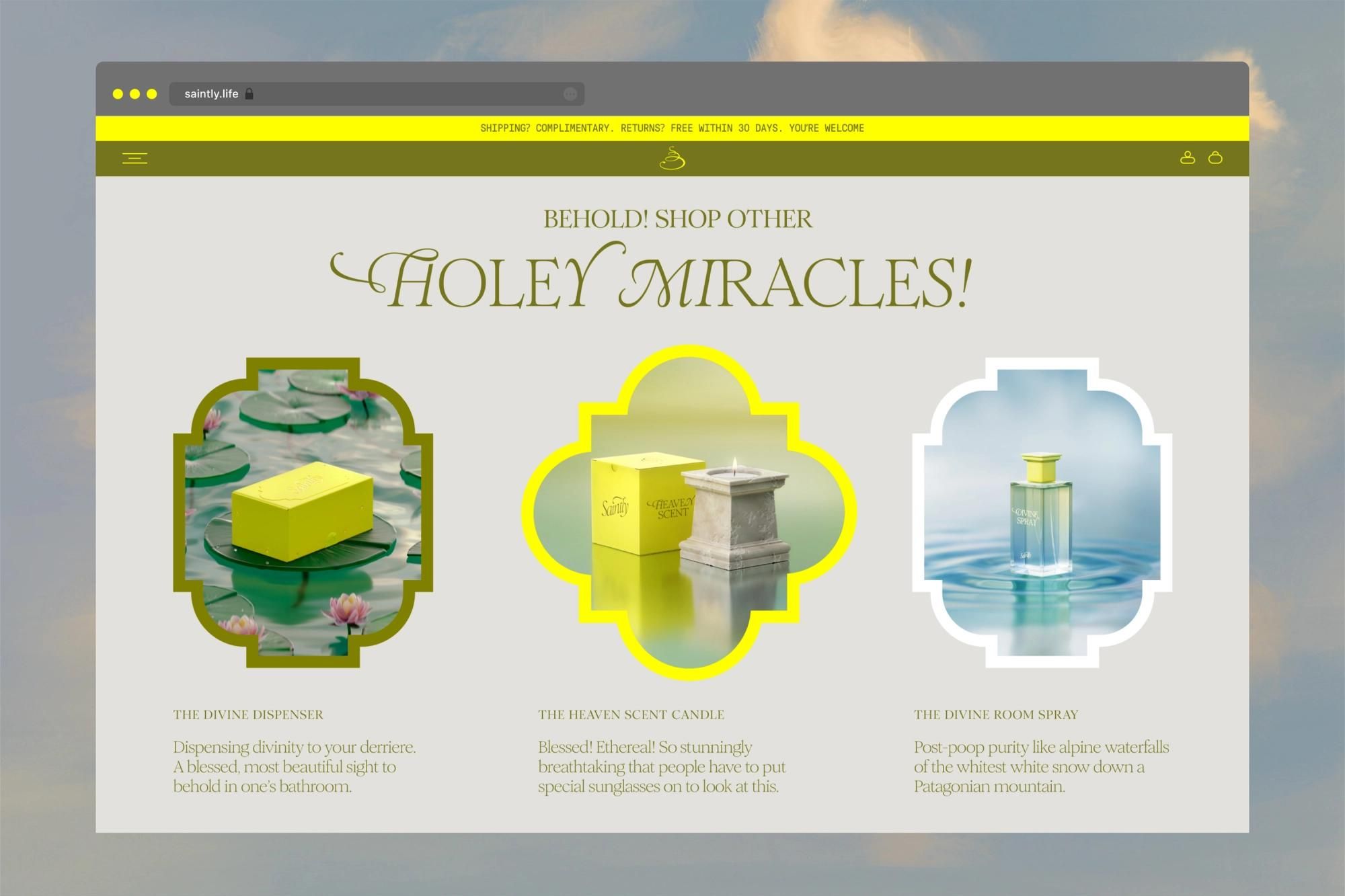 The design employs a soft, light aesthetic with muted greens and pale yellows set against a light background, suggesting a natural or artisanal product focus. The layout is clean and balanced, using distinct visual blocks to highlight featured items.