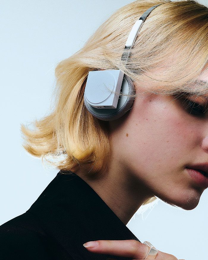 This image showcases a highly refined minimalist aesthetic, blending soft natural lighting with sharp focus on modern audio technology. The visual language emphasizes clean lines, neutral tones, and sophisticated texture, creating a serene yet contemporary portrait.