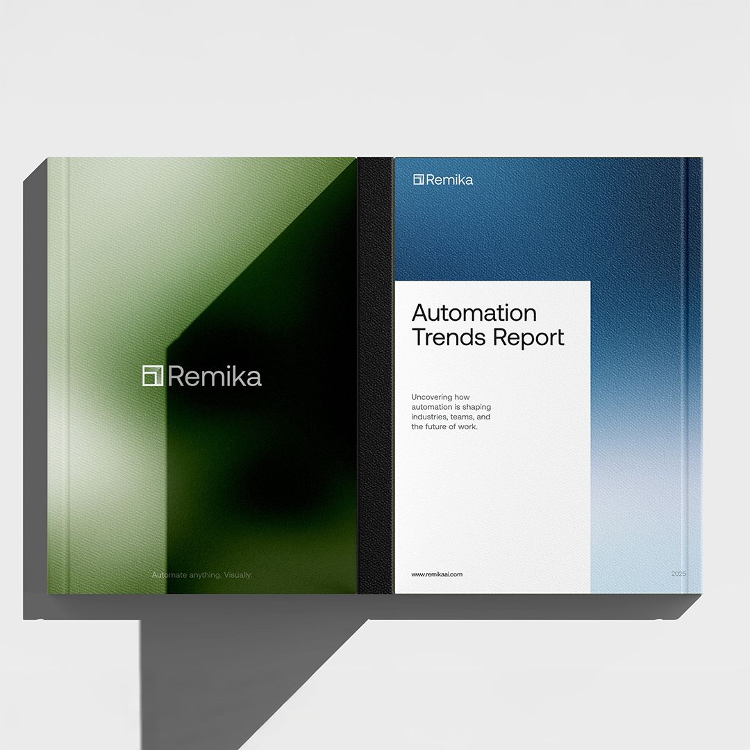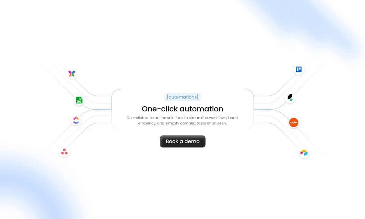 The design features a clean, minimalist layout centered around a key value proposition ('One-click automation') using subtle line art to suggest connectivity and workflow. The visual language is modern, professional, and airy, relying heavily on white space to convey simplicity and efficiency.
