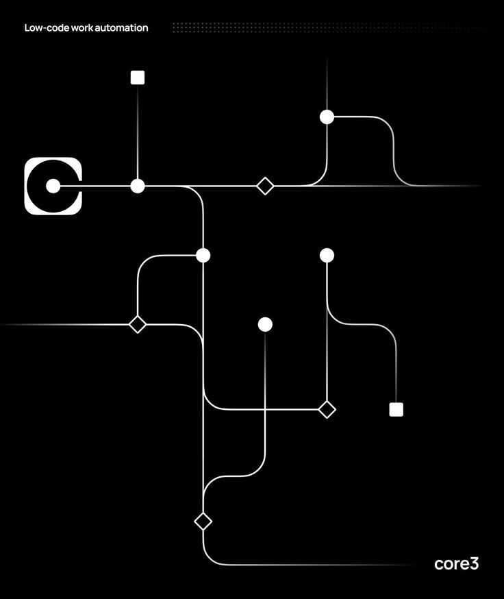 This image presents a minimalist, technical diagram resembling a circuit or workflow map using thin white lines on a black background. The design emphasizes connectivity, logic, and automation concepts through its clean, abstract representation.