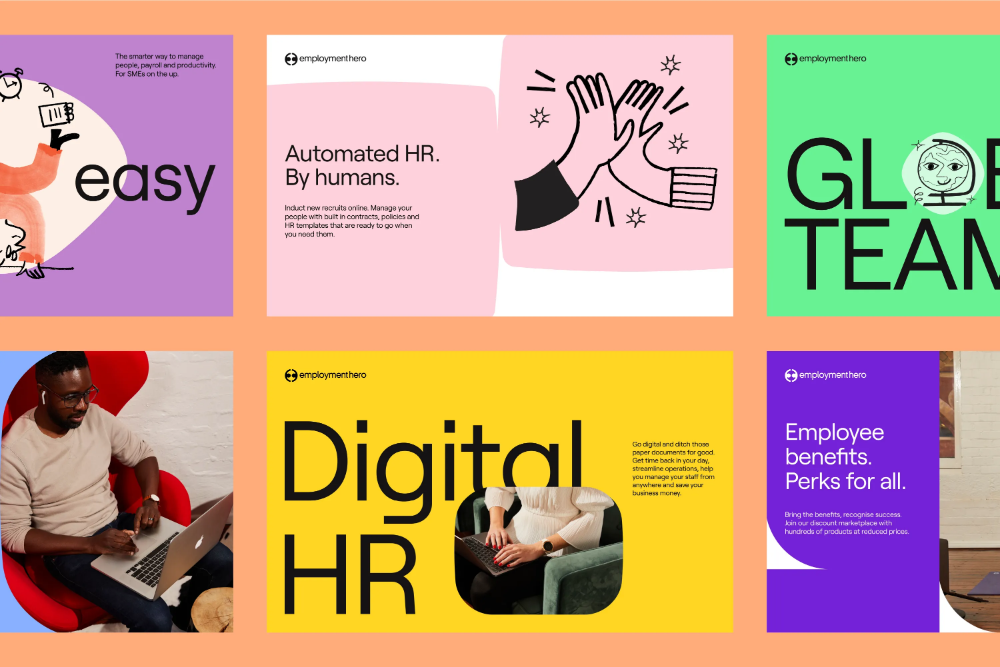 The image displays a series of clean, modern promotional graphics using a bright and professional color palette. The design emphasizes automation, technology, and HR services through simple icons and bold typography.