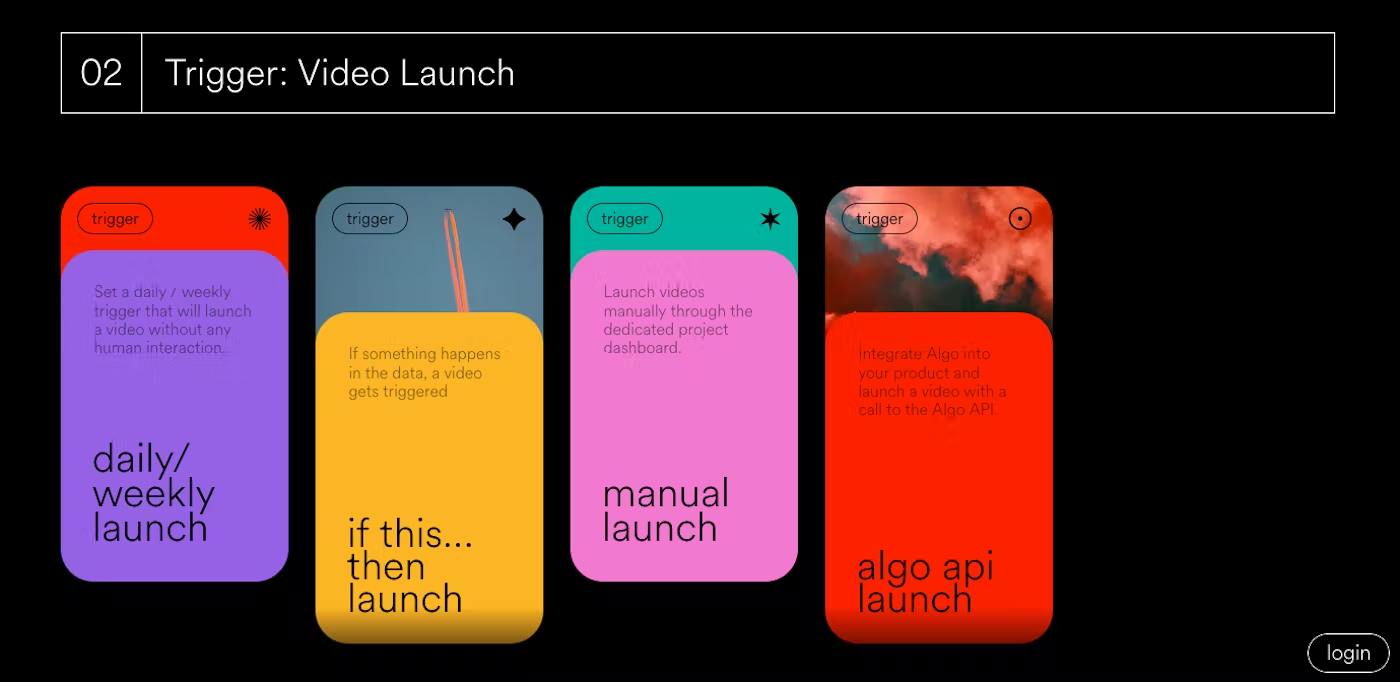 The image presents a clean, modern interface design showcasing different trigger options for a 'Video Launch' feature. It uses distinct, vibrant colors and clear iconography to differentiate functional states or options effectively.
