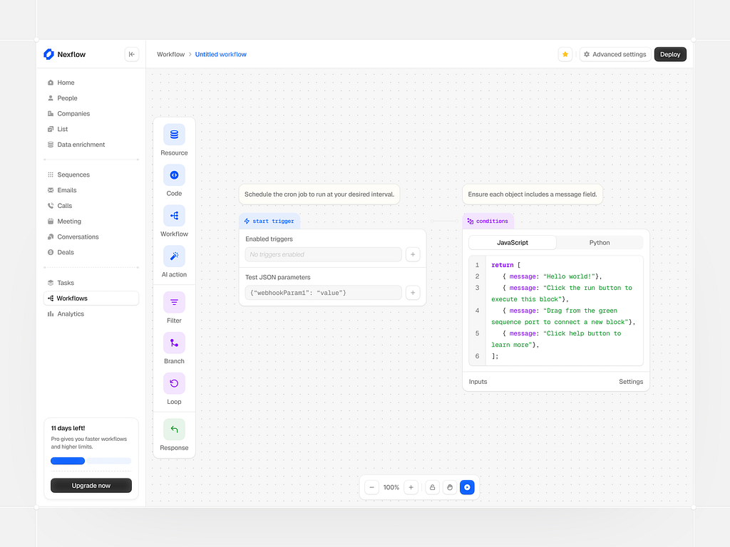 This interface features a clean, professional design utilizing ample white space to ensure high readability and focus on the workflow canvas. The visual language is modern and functional, employing subtle gray tones for structure while maintaining a light, airy feel. The layout is highly organized, separating navigation from the main editing area effectively.