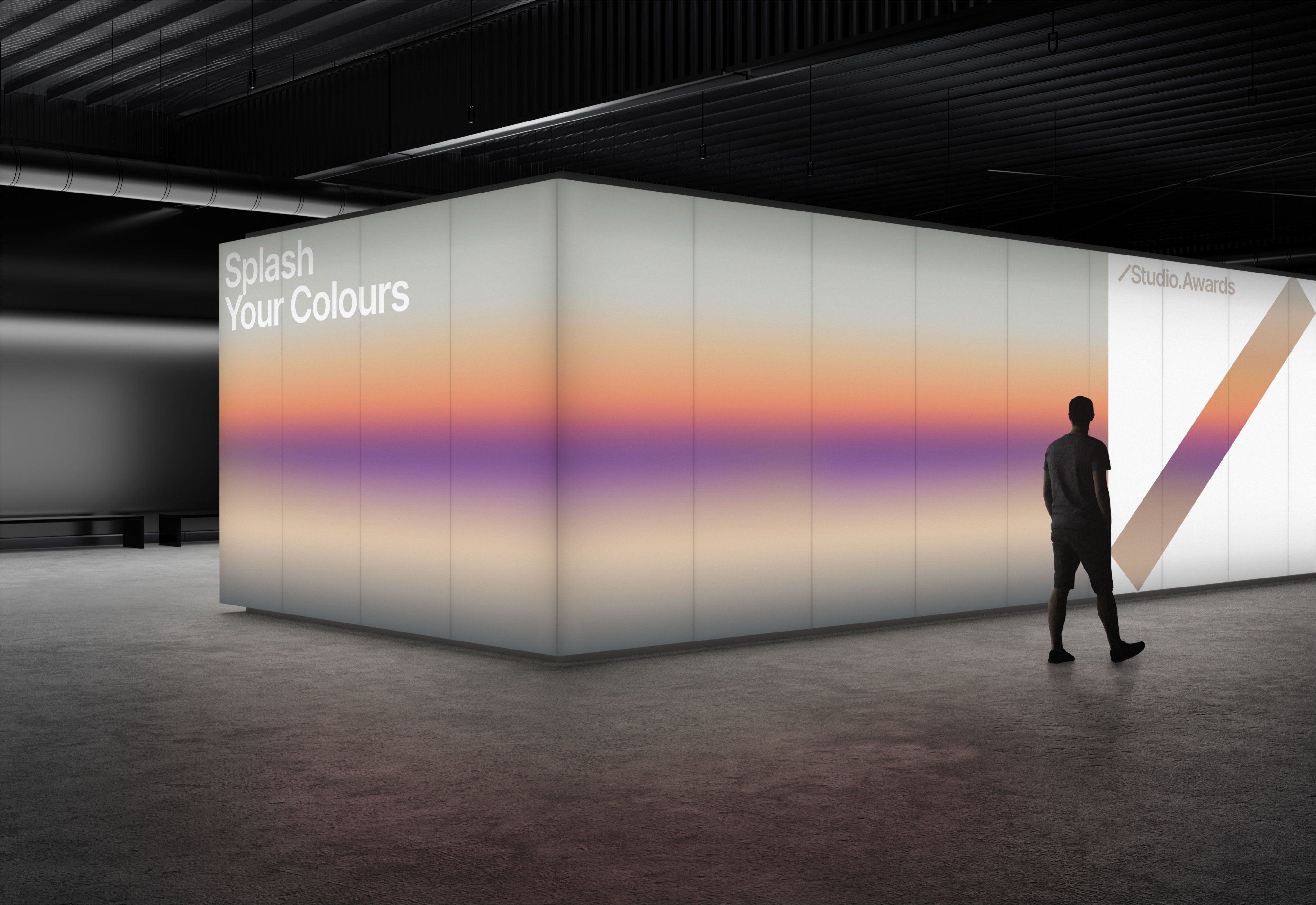 The image showcases a modern, minimalist exhibition display featuring a large, illuminated panel with a soft gradient of sunset colors. The design emphasizes clean lines, subtle color transitions, and a sophisticated, contemporary aesthetic suitable for an awards show or design gallery.