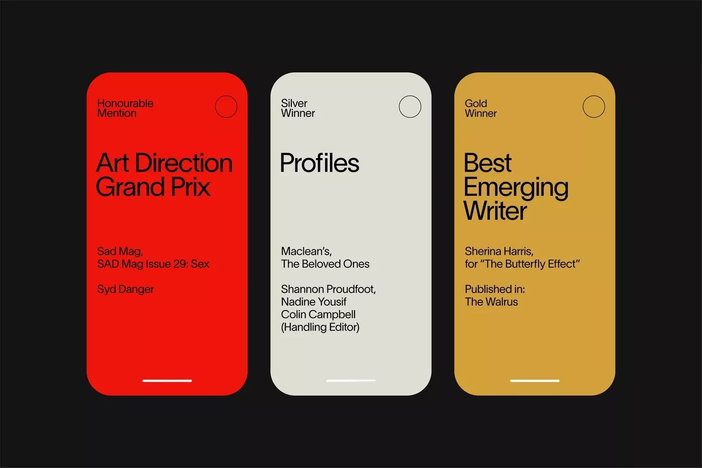 The image displays three distinct, minimalist mobile app screen mockups, each representing an award or profile. The design utilizes a strong, high-contrast color scheme with clean typography and ample white space to convey a sense of prestige and modern professionalism.