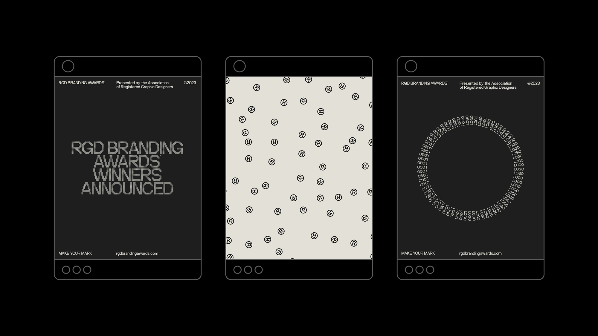 This set of visuals demonstrates a clean, professional design language characterized by high contrast and minimalism. The presentation effectively combines clear typography with subtle geometric patterns to create a sophisticated and authoritative branding identity suitable for awards or corporate announcements.