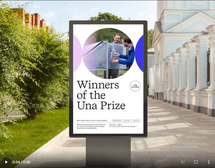 A contemporary digital billboard design featuring a minimalist aesthetic with clean typography and a circular photographic element. The composition balances institutional gravitas with modern accessibility, showcasing an award or prize announcement with refined visual hierarchy and ample white space.