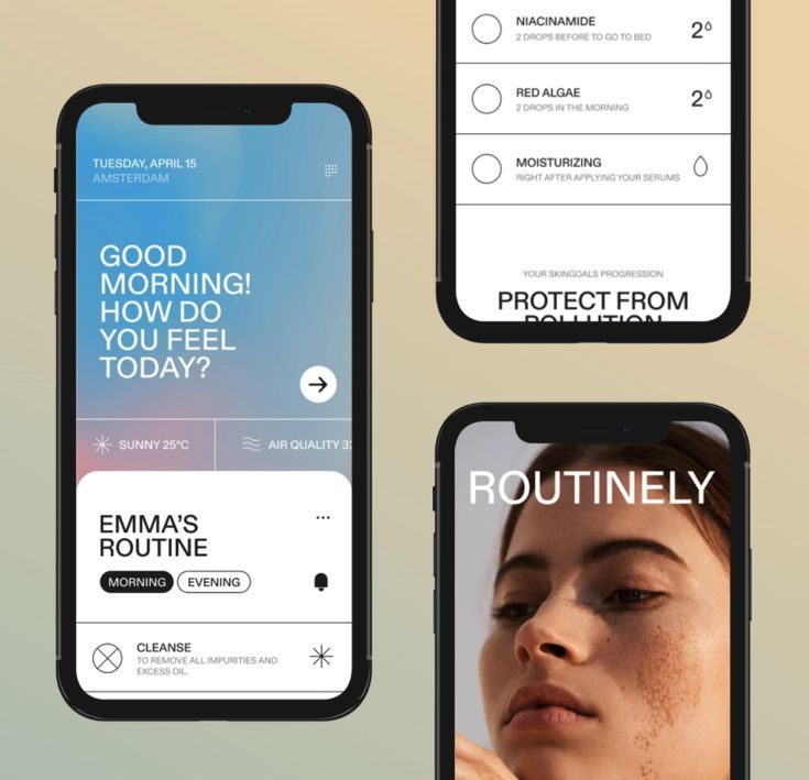 The image presents a clean, modern mobile application interface design, likely for skincare or beauty routines. It uses a light, airy aesthetic with clear typography and ample white space to convey a sense of professionalism and simplicity.