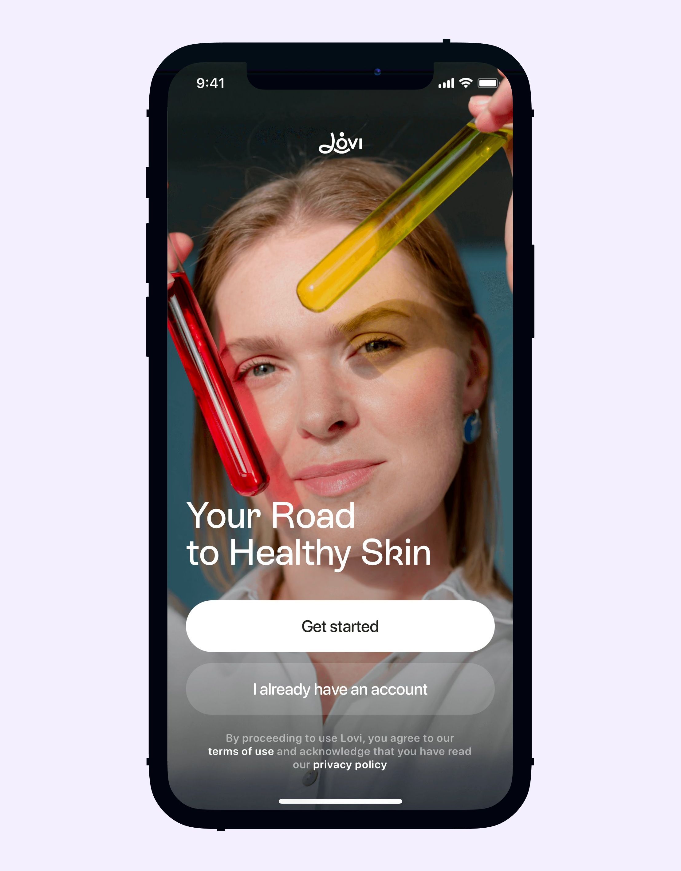 This mobile interface features a clean, modern aesthetic that blends high-quality lifestyle photography with simple functional UI elements. The visual language is soft and luminous, using natural tones to evoke a feeling of health, beauty, and trustworthiness. The design successfully uses imagery to market a skin-related product or service.