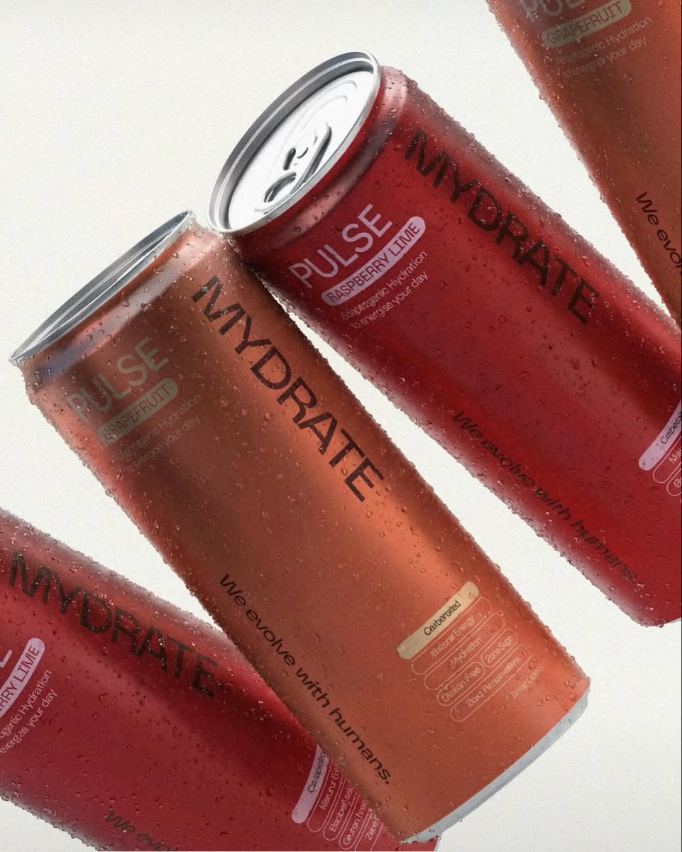 This image showcases vibrant, commercially packaged beverages with a modern and energetic design aesthetic. The visual language relies on bold color contrasts and clean typography to communicate freshness and vitality. The close-up composition emphasizes the texture and metallic sheen of the cans, appealing to a health-conscious consumer.