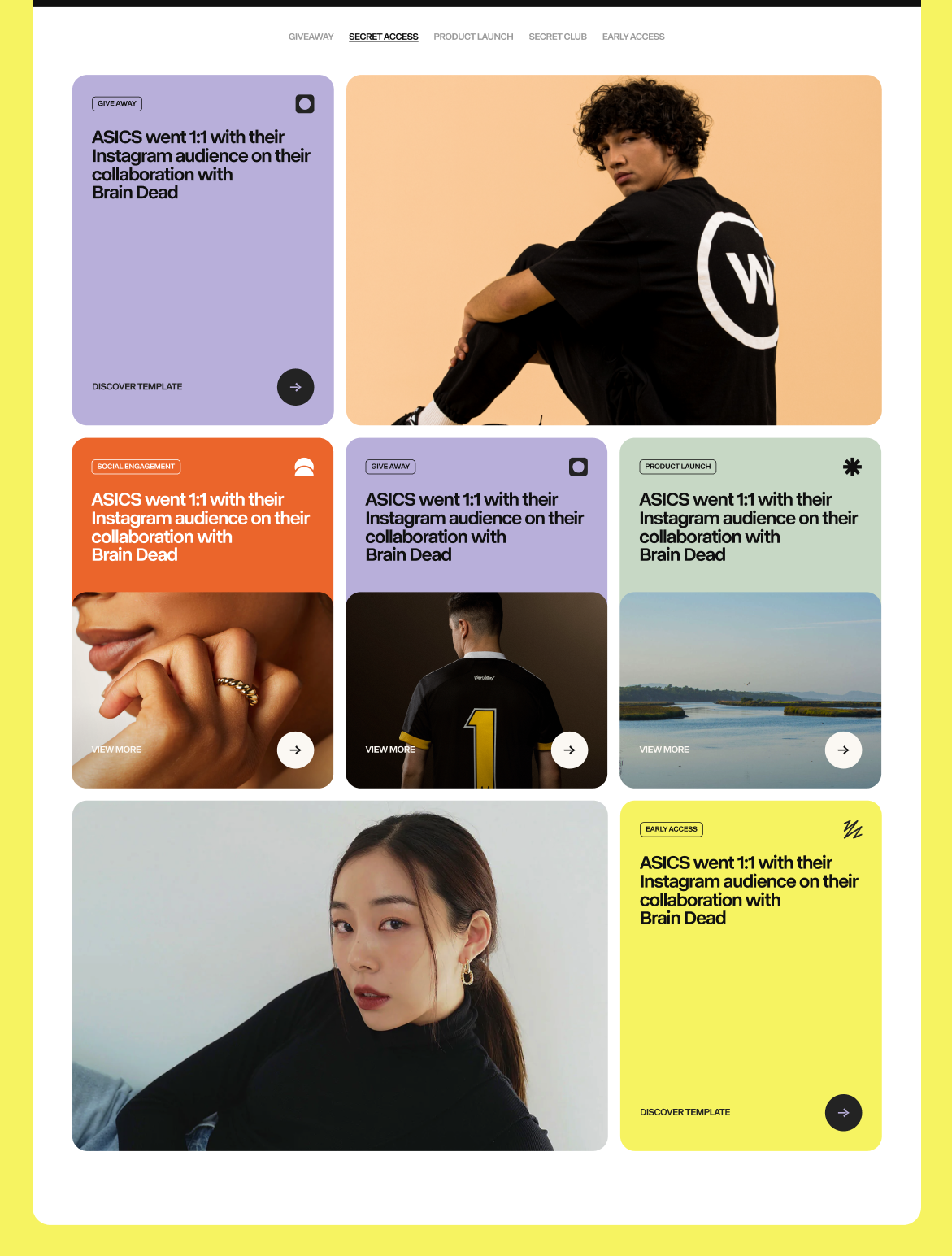 This design showcases a clean, high-contrast editorial aesthetic suitable for social media collaborations or brand storytelling. The visual language relies heavily on strong photographic elements, minimalist layouts, and clear navigation to present compelling content.