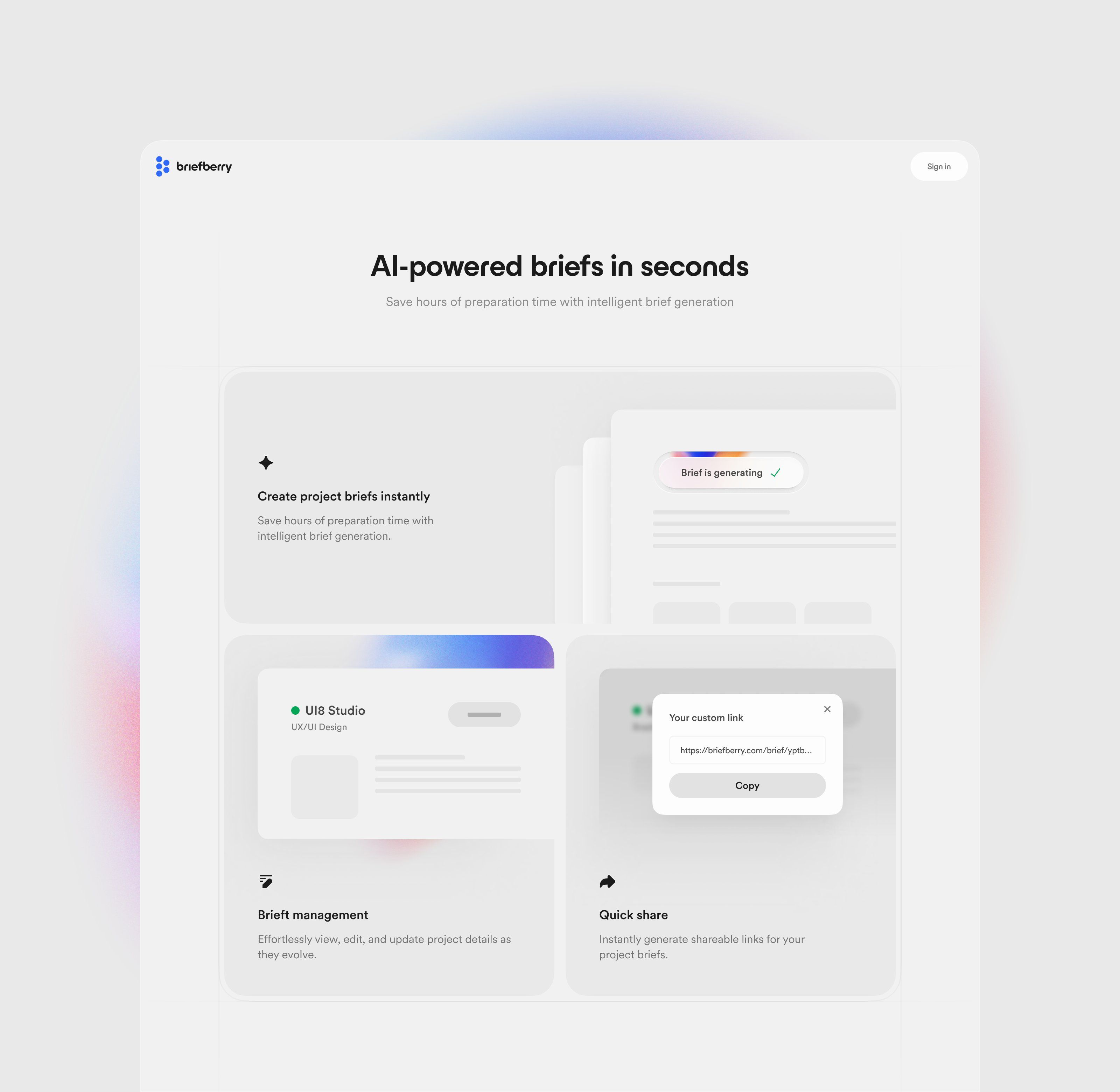 The design presents a clean, modern, and professional interface for a service related to brief generation. It utilizes ample white space and subtle color accents to guide the user through distinct functional blocks, conveying efficiency and ease of use.