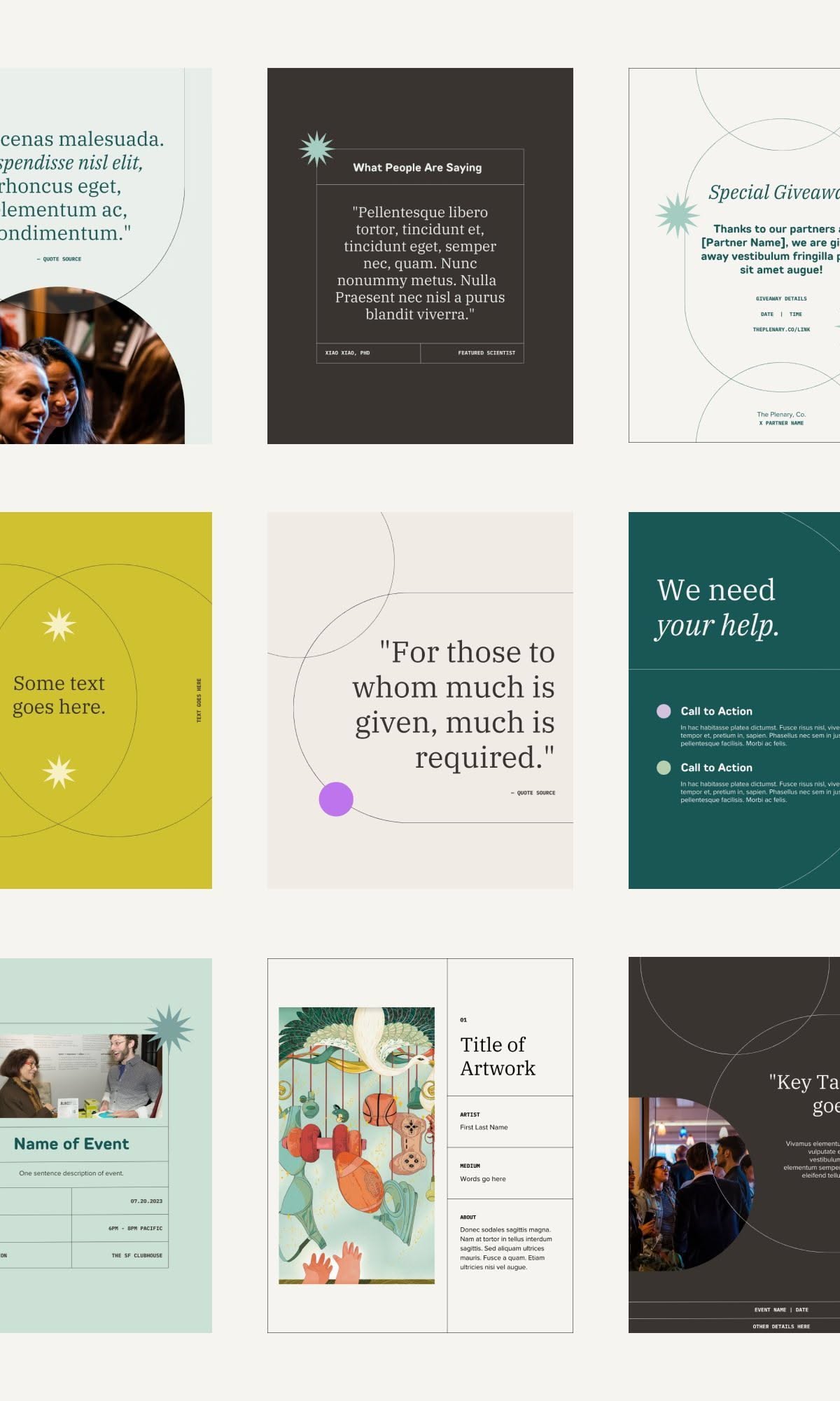The image displays a collection of minimalist, clean, and professional design templates, characterized by ample white space and subtle use of geometric shapes. The overall visual language is modern, sophisticated, and focused on clear communication.