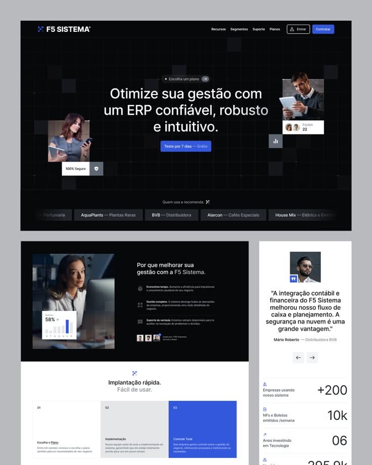 This visual employs a high-contrast, modern design utilizing strong geometric shapes and professional photography to convey corporate reliability. The layout is segmented into distinct informational blocks, effectively pairing aspirational imagery with clear calls to action regarding business optimization.