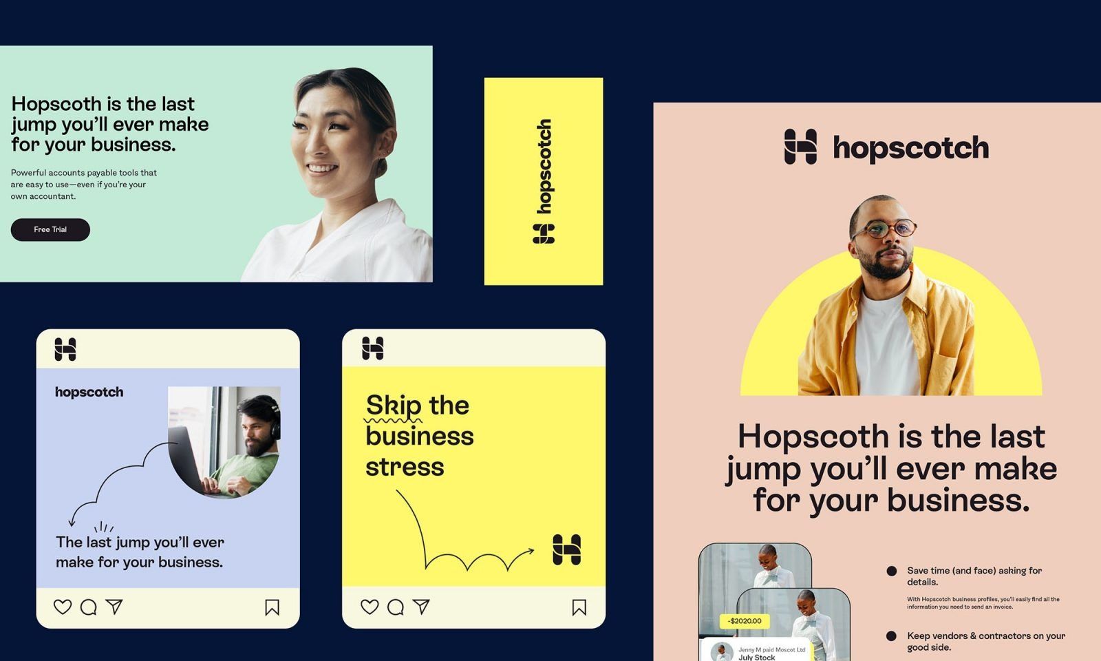 The image presents a clean, modern, and professional interface design focused on a SaaS product called 'Hopscotch'. It uses a light, warm color palette contrasted with deep navy/purple accents to convey trust and ease of use.
