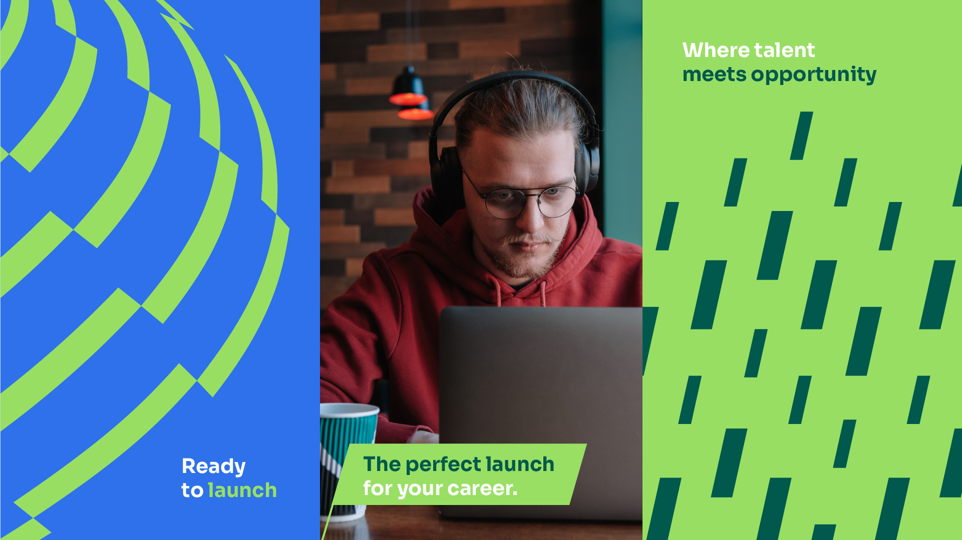 The image uses a vibrant, modern design with a split layout featuring bold geometric shapes and a focused portrait. The visual language is clean, professional, and energetic, utilizing high contrast between the blue/green elements and the warm tones of the subject.