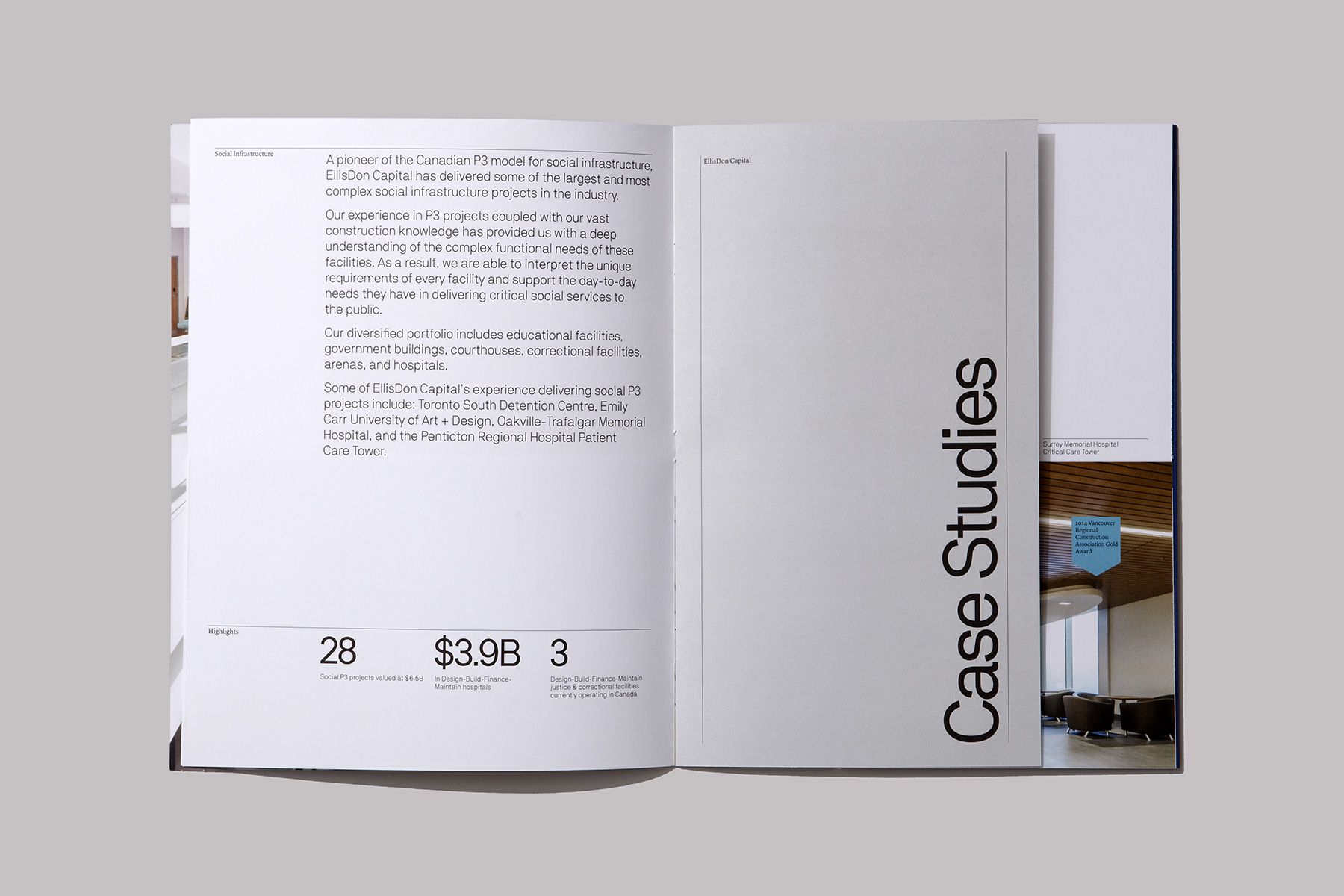 A minimalist editorial design featuring an open magazine or publication spread with clean typography and ample whitespace. The layout demonstrates contemporary design principles with a focus on readability and visual hierarchy, combining text-heavy content with a striking vertical title treatment and architectural photography.