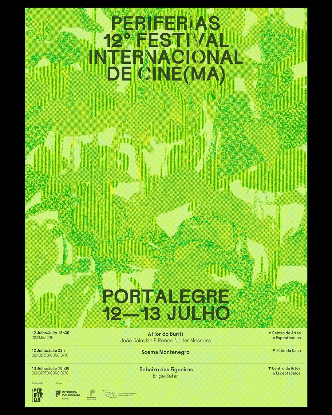 A vibrant festival poster for an international cinema event featuring a bold monochromatic lime-green color scheme with abstract organic textures and layered imagery. The design employs a contemporary minimalist approach with strong typographic hierarchy and atmospheric depth created through overlapping translucent elements.