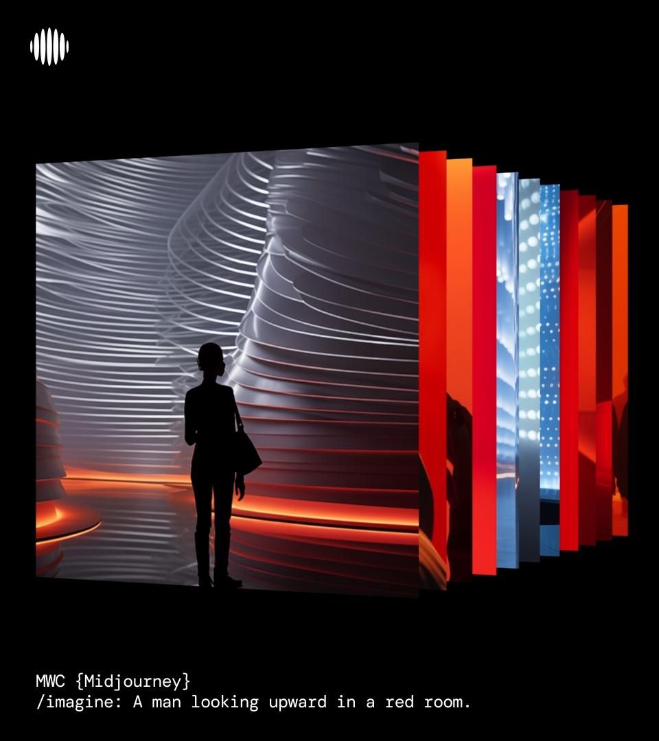 This image presents a dramatic study in fluid architecture and high contrast, utilizing sweeping curved surfaces to create an immersive, almost sculptural environment. The visual language balances organic curves with stark vertical lines and intense chromatic blocks, resulting in a sophisticated and deeply atmospheric scene.